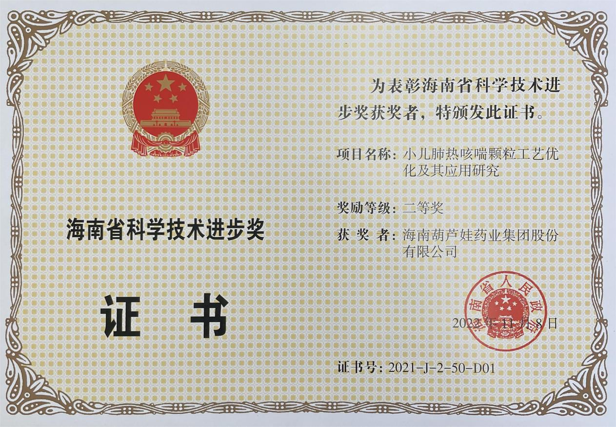 为此,小儿肺热咳喘颗粒的制备方法获得了第二十一届中国专利优秀奖(2019年),专利申请号:ZL201010134951,此次作为专利技术的应用,获得了2021年度海南省科学技术进步奖二等奖。在此之前,ag博天堂牌小儿肺热咳喘颗粒还多次被授予“临床价值中成药品牌”、“中国连锁药店最具合作价值单品”,荣登“中国医药品牌榜”。